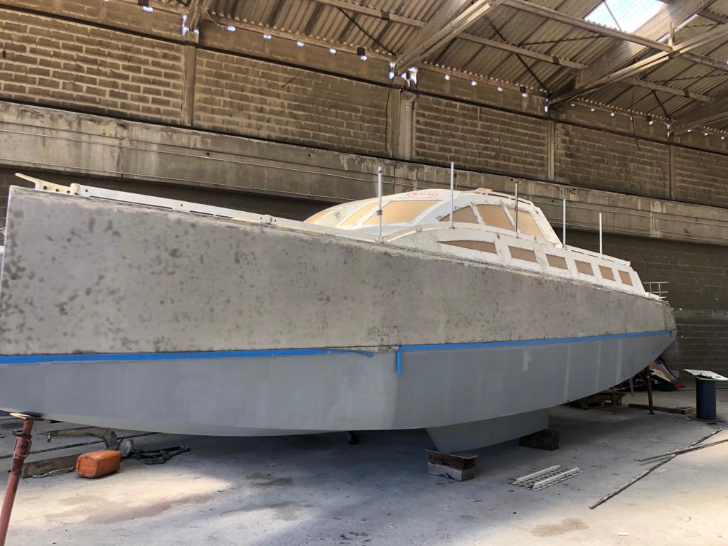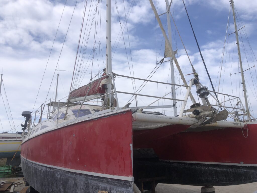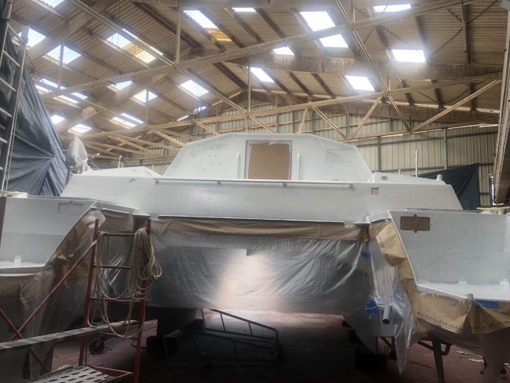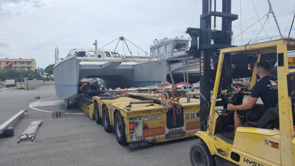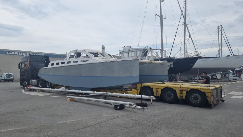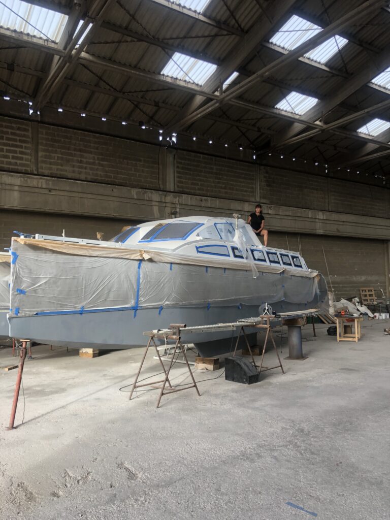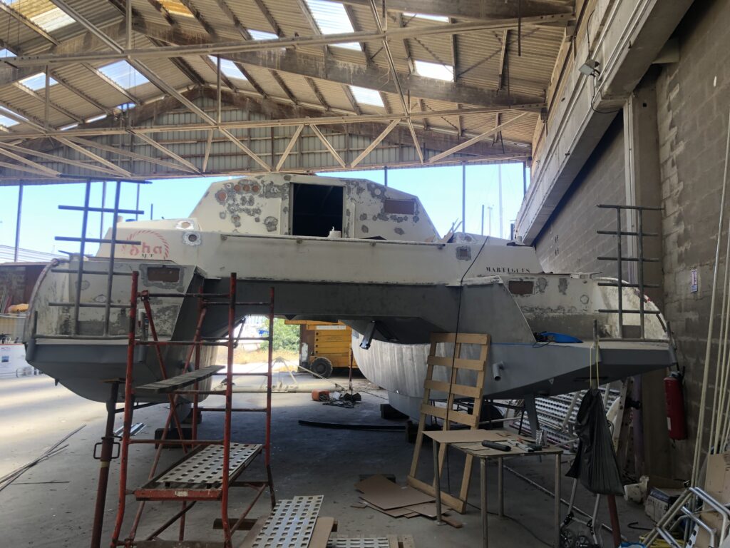 Ellen et moi avons acheté le bateau en Aout 2022 à PORT LEUCATE. C’est un Catflotteur 38 construit en STRONGAL (1993) par le chantier PROMETA (Spin Off de META). Le catamaran a la particularité de mesurer 5 m de large ce qui lui permet de naviguer sur les canaux. SHA était échoué sur le chantier KARINA ULYXSIS (Aujourd’hui CATANA) après 30 ans de maintenance hasardeuse. Les travaux ont réellement démarré fin 2022, et la mise à nue totale de la coque Intérieur et extérieur a été terminé en juin 2023. Le Bateau est alors parti par Convoi Exceptionnel pour le chantier META YACHT SERVICE à Port Navy Service  (Port Saint Louis du Rhône).