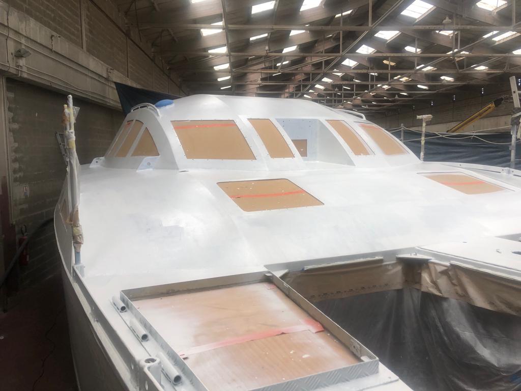 A la ponceuse à main (4 on été abusées …),  100%  de l’intérieur y est passé pas un millimètre carré n’a été épargné de Mars à Mai 2023 à Port Leucate. Heureusement que la Tramontane emportait la poussière… Je me suis alors souvent maudit de ne pas avoir acheté une coque nue neuve à un chantier comme je l’avais fait 20 ans plus tôt. Ça à été si pénible que nous avons perdu les photos, un acte manqué …Ci dessous un aperçu du résultat. La coque a l’aspect caractéristique d’une cocote minute géante propre aux bateaux construits en STRONGAL .