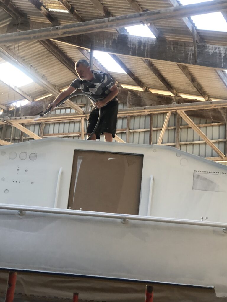Fredéric, son employé (un ancien Légionnaire très efficace à la ponceuse à main extrêmement utile pour compléter une sableuse capricieuse) de META YACHT SERVICES et votre serviteur ont, sablé, poncé, traité avec deux couches 409 de MAP, le pont Juillet 2023, pas d’images la non plus mon téléphone à été volé durant la période … Travaux extrêmement pénibles réalisés sous la canicule, jamais plus ça!