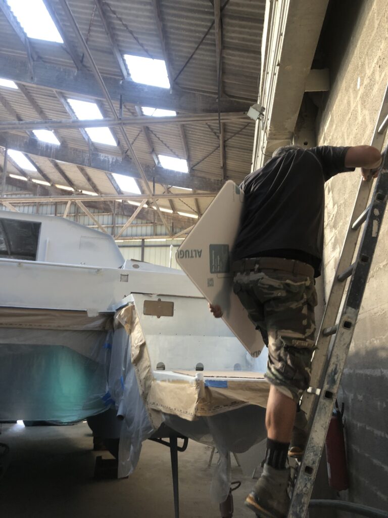 Concernant les panneaux et autres aérateurs nous les avons posés durant la phase d’aménagement. Nous n’avons pas dédié un temps projet spécifique. Comme le bateau était sous hangar ce n’était pas vraiment nécessaire.